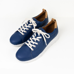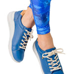 Our blue Vegan Leather Sneakers have a rubber sole made with a surprisingly light and flexible formula for the maximum in comfort and style. The upper area of the shoe is made from cruelty-free vegan leather, and the soft brown microfiber lining allows the foot to breathe. These unique and eco-friendly women's running shoes are only available from Cari Capri.